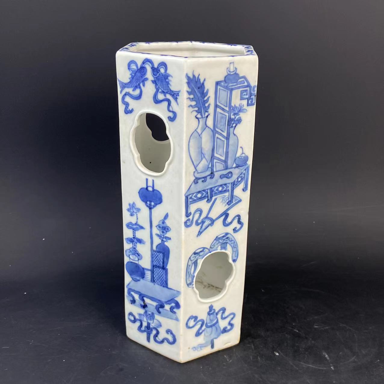 青花开窗六方帽筒